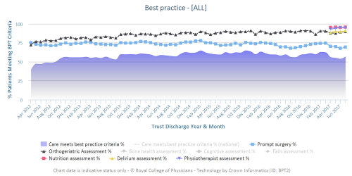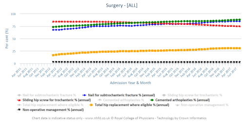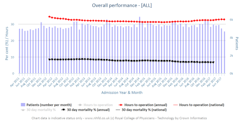 The National Hip Fracture Database is a national clinical audit undertaken by the Royal College of Physicians on behalf of the NHS. We collect data on all aspects of the care given to hip fracture patients in England, Wales and Northern Ireland aged 60 and over. This data is fed back to hospital staff in a number of ways, including annual reports and online run charts, to allow hospitals to track their performance and to facilitate quality improvements.